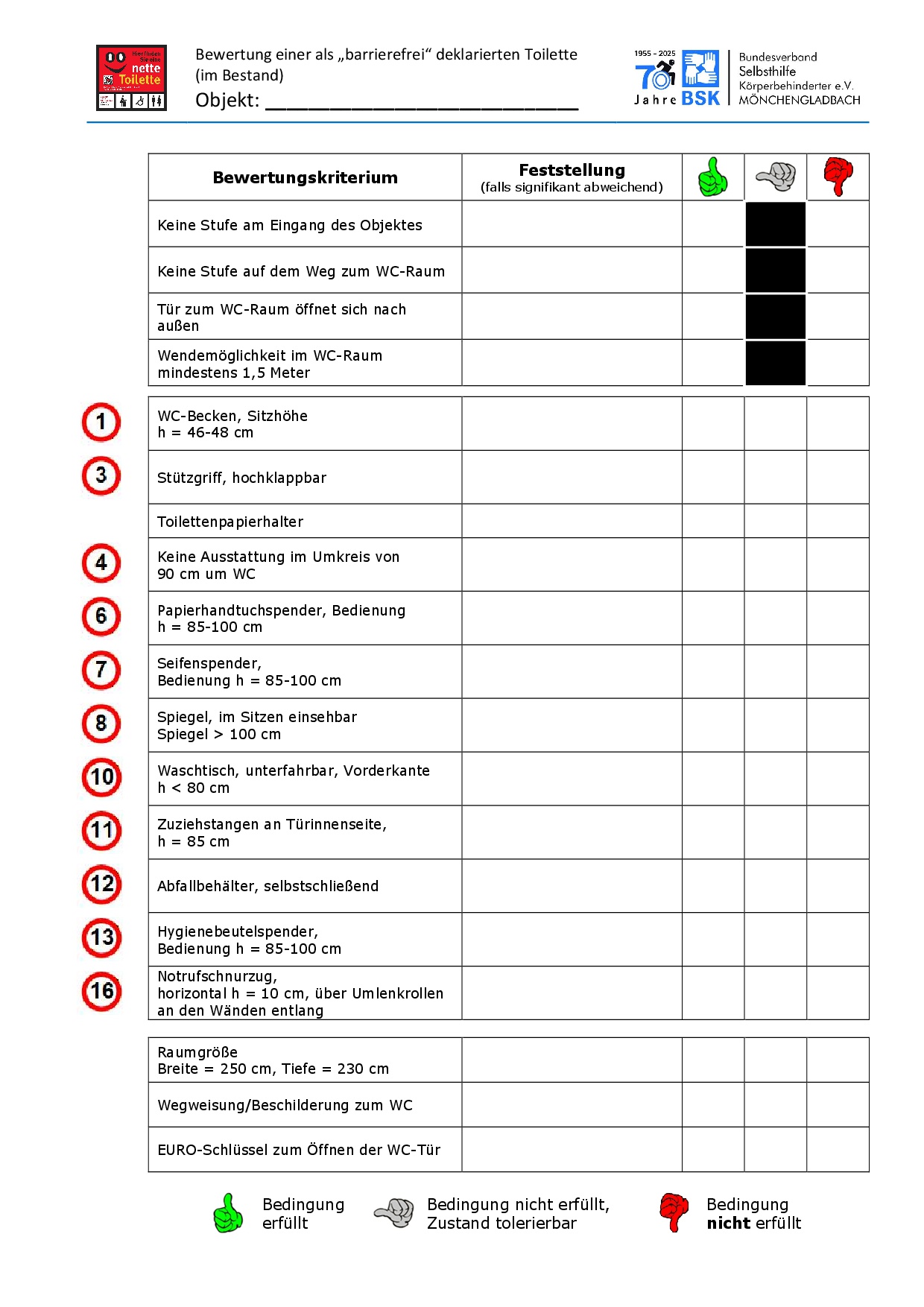 Dass dies bei den meisten Deklarationen nicht zutrifft, hatte das Team der Mönchengladbacher BSK-Kontaktstelle bei Stichproben festgestellt und sah die Notwendigkeit, exemplarisch bei einigen der neun Örtlichkeiten mit vermeintlich “barrierefreien” WC systemantische Faktenchecks durchzuführen, die gesondert veröffentlicht werden.