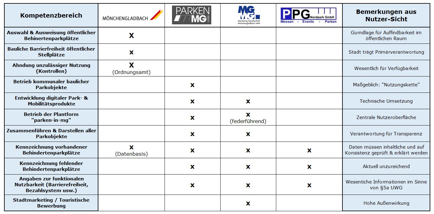 Aufgrund der Vielzahl derer, die unmittelbar oder mittelbar in das Themenfeld „Parkmöglichkeiten in Mönchengladbach“ und damit mit „Behindertenparkplätze“ involviert sind, lässt sich nur erahnen, wer die Umsetzungskompetenzen im Sinne von Zuständigkeit, operativen Umsetzens und Verantwortung haben könnte: