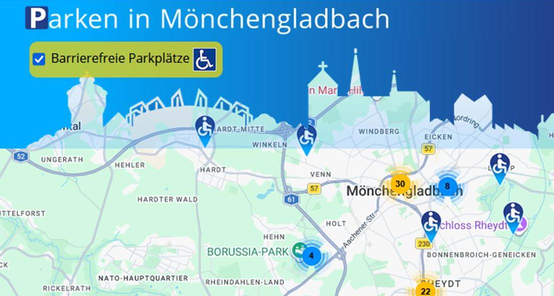 Auch auf der Plattform parken-in-mg.de werden Behinderten­parkplätze an öffentlichen Straßen und in Parkhäusern angezeigt … inklusive Routenplanung.