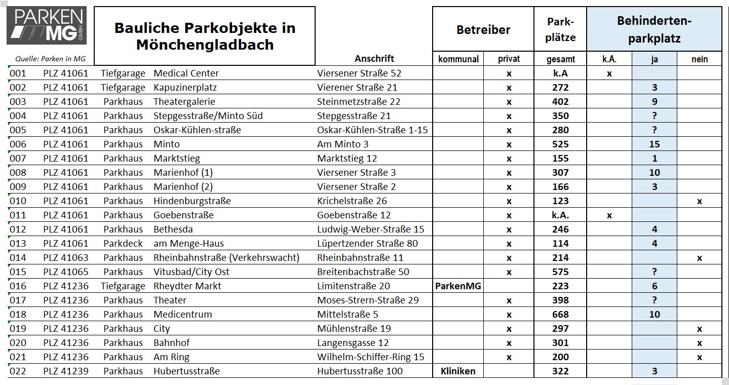 In Mönchengladbach gibt es eine Vielzahl von Behindertenparkplätzen „unter freiem Himmel“ und 22 „bauliche Parkobjekte“ (Parkhäuser, Tiefgaragen, Parkdecks), die von selbstfahrenden Menschen mit Behinderungen genutzt werden könnten, wenn sie denn auch wirklich „nutzbar“ sind.